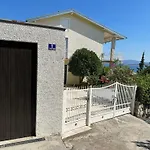 Gasten kunnen genieten van een kust uitzicht op de zee vanaf een terras in de 2-slaapkamer Haus Stipeto Villa Dramalj, op circa 1 km afstand van de Vrtare Male Baai.